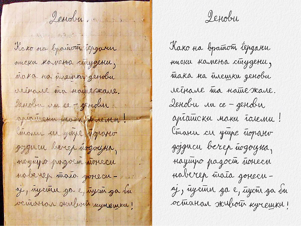 “На сликата лево е оригиналниот ракопис на Рацин, напишан во неговиот бележник, најверојатно со молив, десно од него е мојата дигитализацијата на ракописот, а на сликата најдолу е финалната верзија на фонтот. Досега се изработени 24 мали кирилични букви. Да го чуваме и надградуваме македонското културно наследство, да го запишеме во вечноста каде што никој не може да го избрише”, нагласи Ѓуровски.