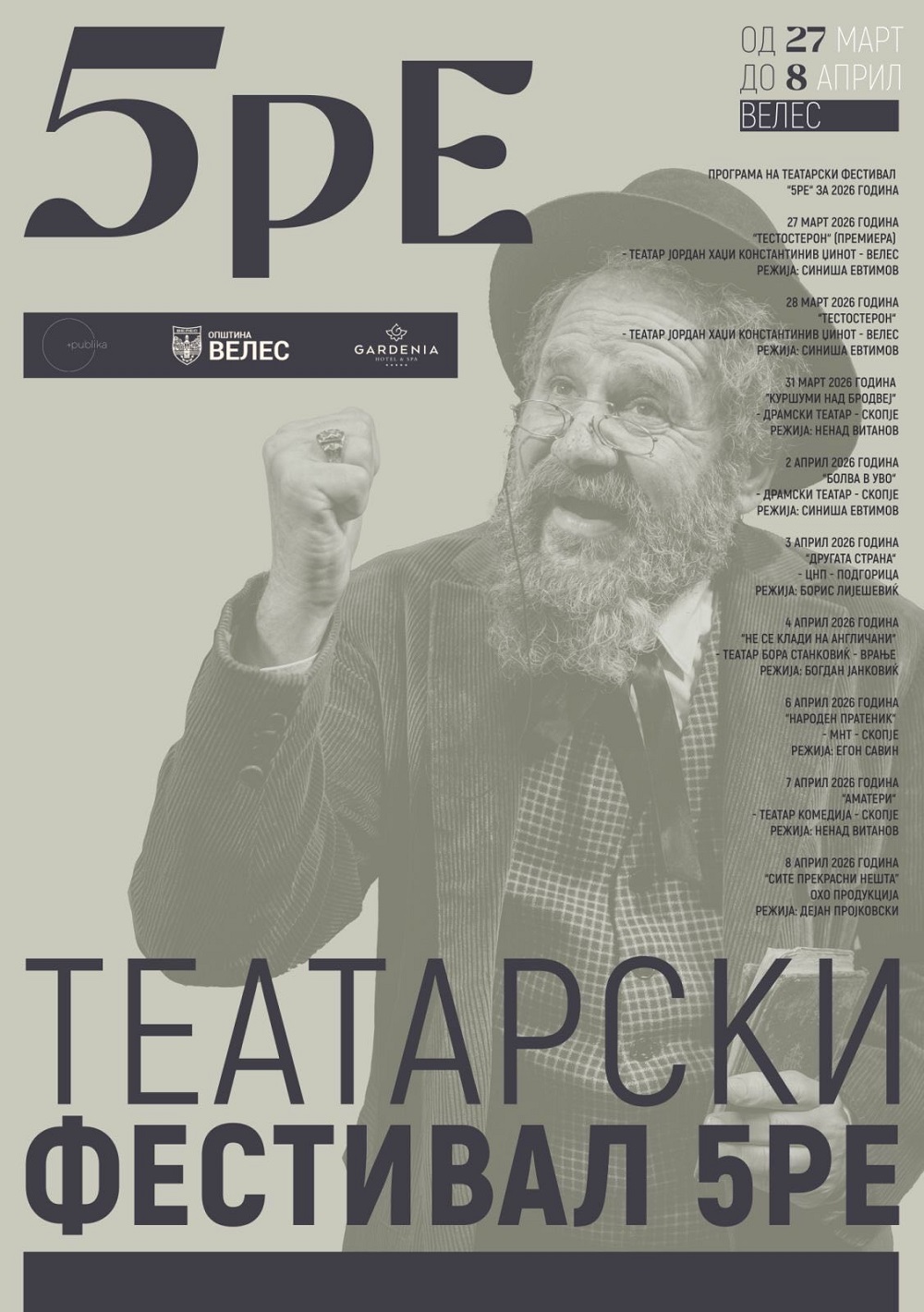 Велес на крајот од март повторно ќе стане центар на театарската уметност. На 27 март започнува јубилејното, петто издание на театарскиот фестивал „5РЕ“, манифестација посветена на доајенот на македонското глумиште и велешанец Петре Прличко.
