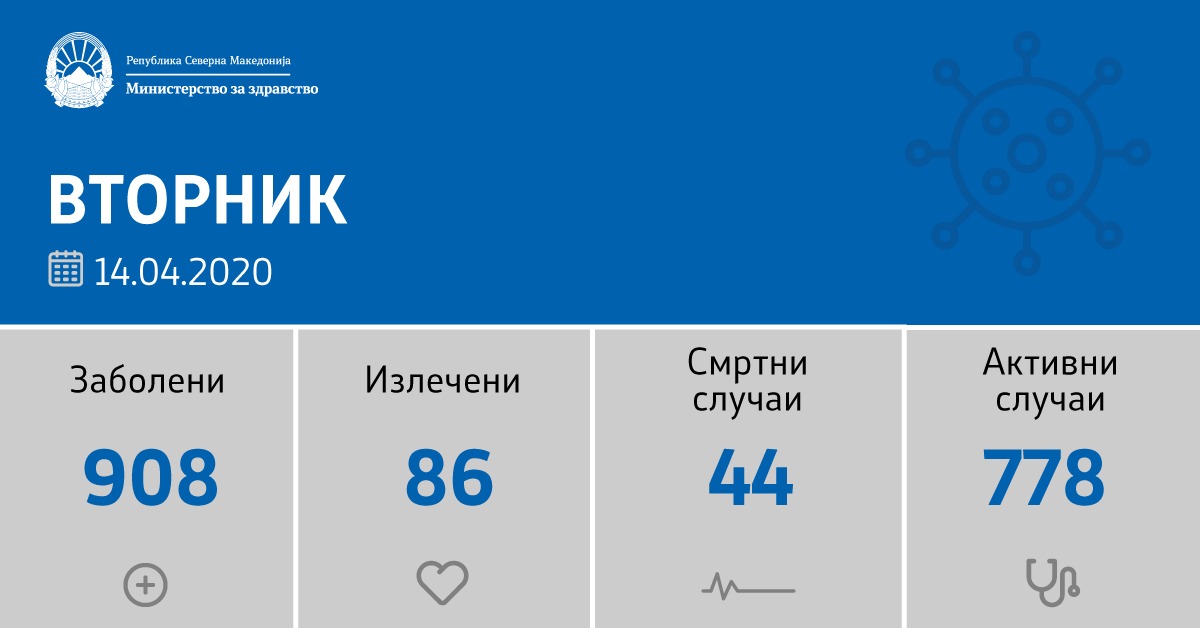 Со ова вкупната бројка на дијагностицирани пациенти со Ковид-19 во нашата земја изнесува 908 лица.