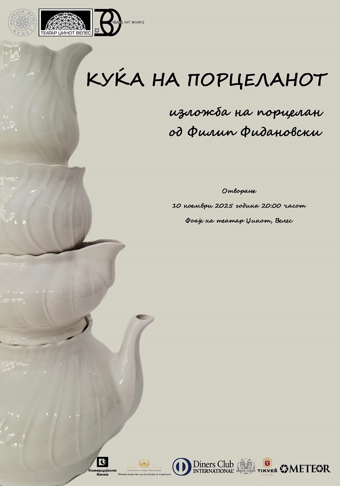 Само еден час подоцна, во 20 часот, во фоајето на Театар „Џинот“ ќе биде отворена втората изложба, „Куќата на порцеланот“ – скулптури и просторни инсталации на современиот уметник и керамичар Филип Фидановски.