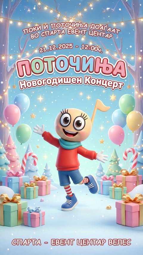 Оваа недела Велес ќе биде центарот на детската радост и предновогодишната еуфорија! Најпопуларниот детски фестивал во Македонија, „Поточиња“, пристигнува во градот за да приреди незаборавен спектакл за најмладата публика. Настанот е закажан за 21 декември (недела) со почеток точно во 12:00 часот, а домаќин на оваа празнична бајка е Спарта Евент Центар (Sparta Event Centar). Организаторите најавуваат програма исполнета со многу музика, танц и интерактивна забава.