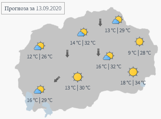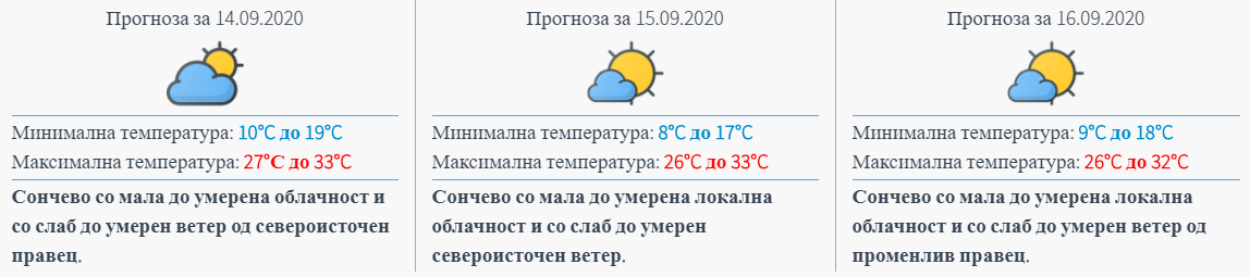 И за утре се најавува сончево и топло време, со мала, до умерена локална облачност и со слаб, до умерен ветер претежно од северен правец. Дневната температура ќе се движи во интервал од 26 до 34 степени.