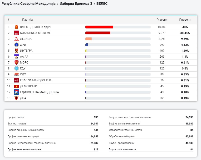Но, ако во контекст на ова се стават и резултатите од ланските претседателски избори, се доаѓа до констатација дека Левица откинала повеќе ВМРО-овски гласови отколку СДСМ-овски. На изборите за шеф на државата излезноста беше речиси иста како и на последните парламентарни избори. Тогаш, за кандидатката на ВМРО ДПМНЕ Гордана Сиљановска гласале 13.285 велешани, а за кандидатот на СДСМ Стево Пендаровски 10.454.